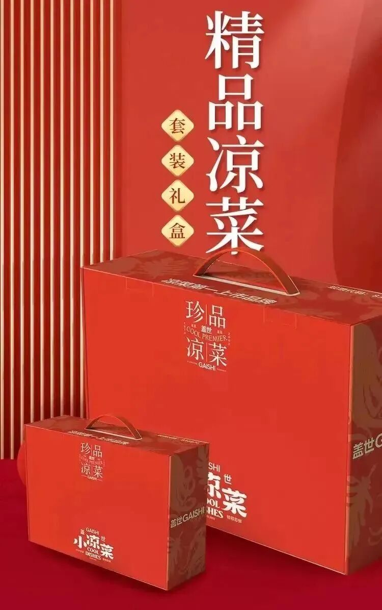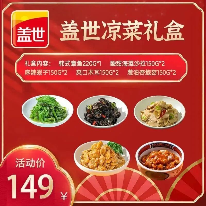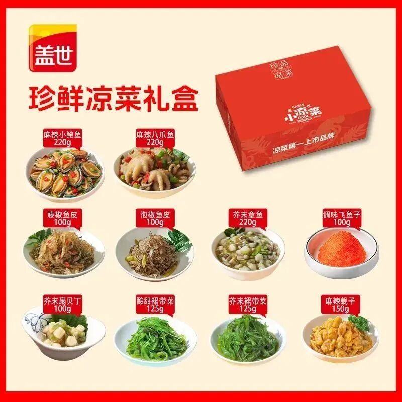 蓋世珍鮮涼菜禮盒是時下各種流行涼菜的“嘉年華式禮盒”。該禮盒裝有麻辣小鮑魚、麻辣八爪魚、藤椒魚皮、泡椒魚皮、芥末章魚、調(diào)味飛魚子、芥末扇貝丁、酸甜裙帶菜、芥末裙帶菜、麻辣蜆子,足足十款,十全十美。可以說,逢年過節(jié),想要解膩解饞的各種經(jīng)典涼菜都集結(jié)于此,一盒呈現(xiàn)。
