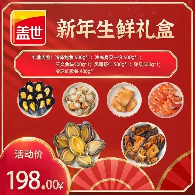 蓋世新年生鮮禮盒是一款原料禮盒,突出匠心甄選,突出純正海鮮,突出品質(zhì)把控,給人踏實的安全感。該款禮盒裝有冷凍鮑魚、冷凍扇貝、三文魚塊、鳳尾蝦仁、貽貝、冷凍紅極參,個個都是海珍硬貨,組合在一起便是一款“王炸級禮盒”。